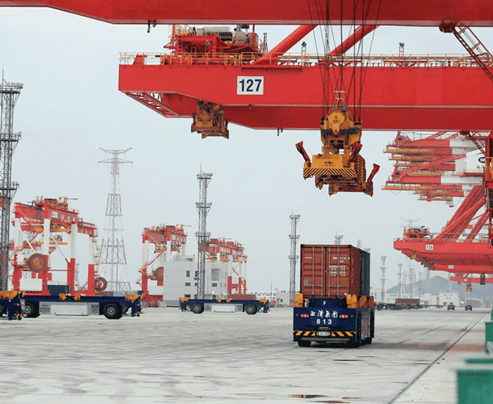 在某國內(nèi)大型物流港口,無人作業(yè)自動引導(dǎo)車車循環(huán)往來,超車換道、裝箱卸貨、多車協(xié)同等作業(yè)流暢鏈接……