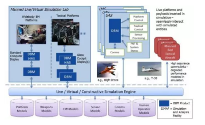 - 2018年1月,DARPA已向BAE系統(tǒng)公司授予DBM項(xiàng)目第三階段合同,前兩階段發(fā)展的成果能讓有人/無(wú)人機(jī)編組在干擾環(huán)境中飛行,具備回避威脅和攻擊目標(biāo)的能力。圖3是DBM項(xiàng)目的能力驗(yàn)證環(huán)境。