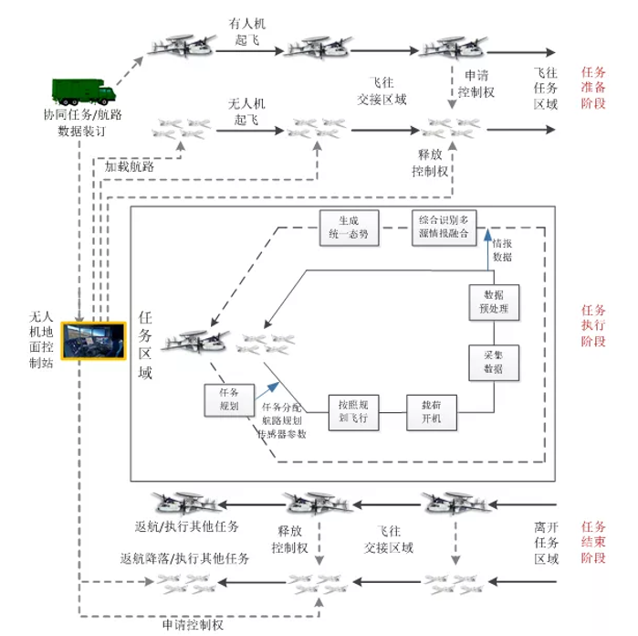 有人/無(wú)人機(jī)協(xié)同作戰(zhàn)典型作戰(zhàn)流程如圖10所示,共分成任務(wù)準(zhǔn)備階段、任務(wù)執(zhí)行階段和任務(wù)結(jié)束階段。
